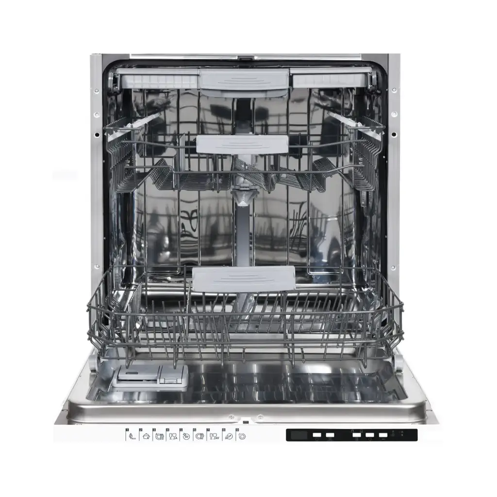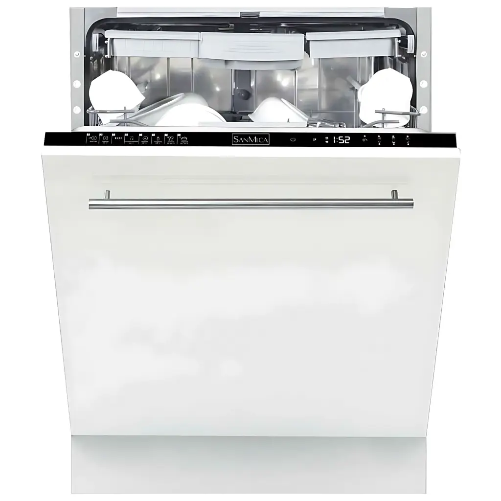 Introducing the Sanmica Built-In Fully-Integrated Dishwasher model SMD159FI, a high-performance 60 cm solution for your kitchen. It accommodates 16 place settings with 9 versatile wash programs, including eco, quick, delicate, and intensive cycles. The stainless-steel tub, turbidity sensor, and super active drying system ensure optimal cleaning and drying results. The dishwasher features electronic water softener, overflow & leakage protection, heater protection, and intuitive LED/floor indicators for easy monitoring. Operates quietly at 45 dB, combining efficiency with a peaceful kitchen experience. Accessories include 2 baskets, a 3rd rack, and a rotating top nozzle for added convenience.